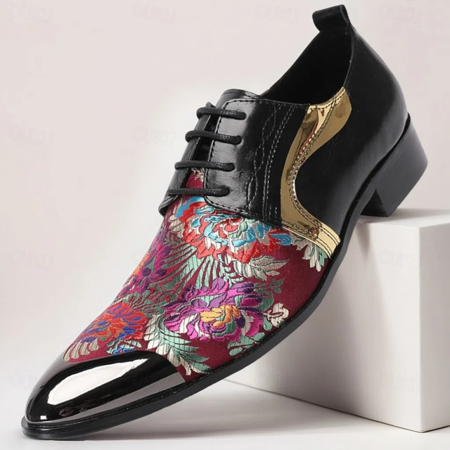 Sapatos Oxford em Couro Vermelho e Roxo Masculinos com Padrão Floral e Design de Cadarço com Ponta Dourada–Elegantes Fashion-forward Ideais para Ocasiões Formais e Festas