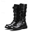 Men's Black Leather Motorcycle Boots with Buckle Straps and Lace-Up Design for Biker Style |