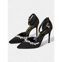 Women's Black Satin Pointed Toe Stiletto Heels with Crystal Embellishments and Ankle Strap - Elegant Party Shoes for Cocktail and Evening Events |