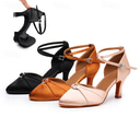 Women's Black Satin Latin Dance Shoes - Elegant Ankle Strap Heels with Rhinestone Buckle and Suede Sole for Ballroom and Salsa Performances |