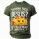 Men's Bible Funny Christian Graphic T-Shirt - 'Wanna Taco Bout Jesus Lettuce Pray' Pun Design with Mark 16:15, Short Sleeve |