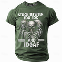 Men's Graphic T-Shirt Stuck Between IDK, IDC & IDGAF Funny Skeletons Short Sleeve Tee |