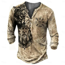 Men's Graphic Viking Henley Shirt Long Sleeve 3D Print Daily Casual Vintage Retro Casual Holiday Going out Spring & Fall Khaki Henley Henley T-Shirt