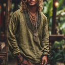 Men's Shirt Linen Shirt Viking Style Popover Shirt Summer Shirt Beach Wear Geometric Vacation Street Yellow Purple Green Long Sleeve V Neck Summer Spring Clothing Apparel