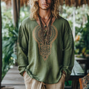 Men's Linen Shirt Summer Shirt Vintage Shirt Ethnic Shirt Long Sleeve Shirt Boho Vacation Street Green Long Sleeve V Neck Summer Spring Clothing Apparel Ethnic |