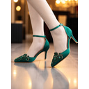 Women's Emerald Green Satin Ankle Strap Heels – Pointed Toe Cocktail Shoes with Crystal Embellishments for Parties and Weddings |