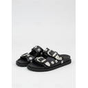 Women's Western-Inspired Black Slide Sandals - Silver Buckle Embellished Strappy Sandals for Boho and Casual Summer Outfits |