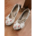 Bridal White Floral Appliqué Low Heel Pumps with Pearl Strap – Romantic Garden Wedding Shoes for Bride & Reception |
