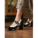 Women's Red and White Patent Leather Mary Jane Heels – 1950s Retro Brogue Style, Chunky Block Heels, Adjustable Buckle Strap, Ideal for Vintage Parties, Costumes and Formal Events |