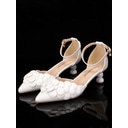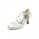 Bridal White Satin Kitten Heel Pumps with Crisscross Strap & Floral Appliqué – Comfortable Wedding Shoes for Garden Ceremony & Reception
