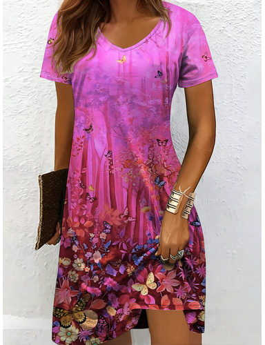 Wearing Mini Dress Rochie Petite Rochie T Shirt Rochie Tee Rochie de Vară Rochie Activă Modă Streetwear În Aer Liber Vacanță Zi de Naștere Croi Regulă Floral Mâneci Scurte Gât în V Roz Albastru Violet