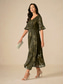 Rochie midi pentru femei, rochie înfășurată, linie A, elegantă, de zi cu zi, pentru invitați de nuntă, jacquard cu sclipici, nod răsucit, croială regulată, evazat, model paisley, mânecă 3/4, decolteu
