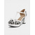 Tocuri înalte cu bandă în T din piele lăcuită neagră de damă, cu ornamente albe și decorațiuni cu fundă - stil retro clasic pentru ocazii speciale