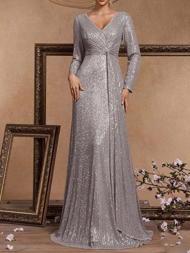 Rochie de seară tip A-Line pentru Evenimentul Black Tie Rochie elegantă Formală de mireasă Lungime de podea Mână lungă Guler în V cu paiete și noduri drapate 2026 - US $115.99 –P8