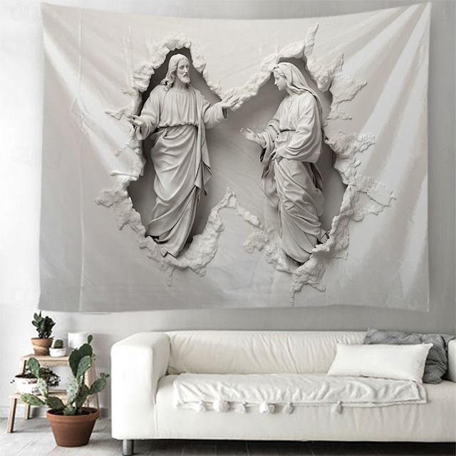 [Design] Cu o uimitoare iluzie optică 3D, tapiseria prezintă două figuri religioase care par a fi sculptate din piatră. Arta detaliată creează un efect vizual uluitor, făcându-l o adăugire unică și artistică pentru decorul tău. Tonurile neutre de gri permit potentarea lui prin îmbinarea perfectă cu diverse teme de design interior.