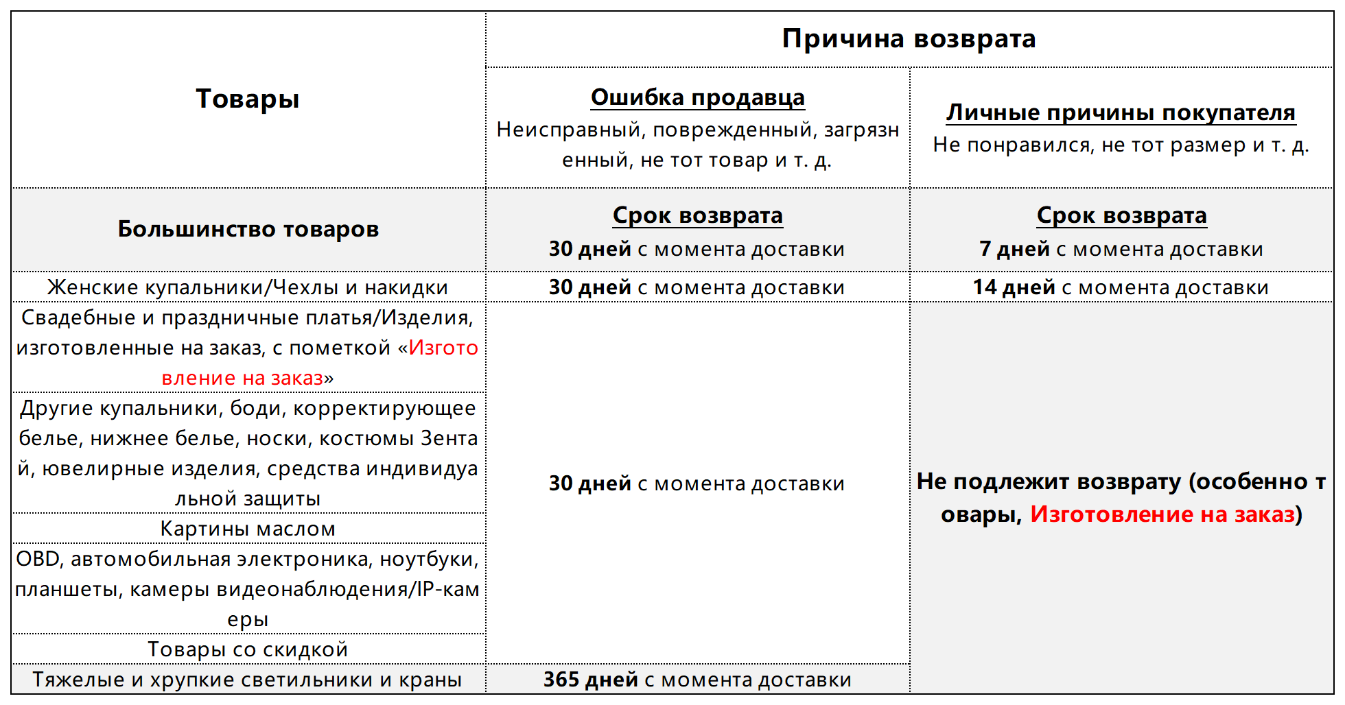 За исключением некоторых товаров на заказ, индивидуализированных или специальных товаров, как требуется законодательством, применимым к вашим местным странам или регионам, большинство товаров могут быть возвращены. Однако конкретные условия варьируются в зависимости от причины возврата и типа товара. Пожалуйста, обратитесь к таблице ниже для получения подробной информации.