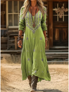 Dam Maxiklänning Vardagsklänning Boho Chic klänningar Långärmad Boho klänning Boho-klänning Elegant bohemliv Stylish Dagligen Strand Semester Normal Blommig Långärmad V-hals Rodnande Rosa Grön Höst