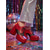Röda platåklackar i lackimitationsläder för kvinnor – grova höga klackar med spänne, djärv retrostil från 1980-talet för fester, formella evenemang och jul