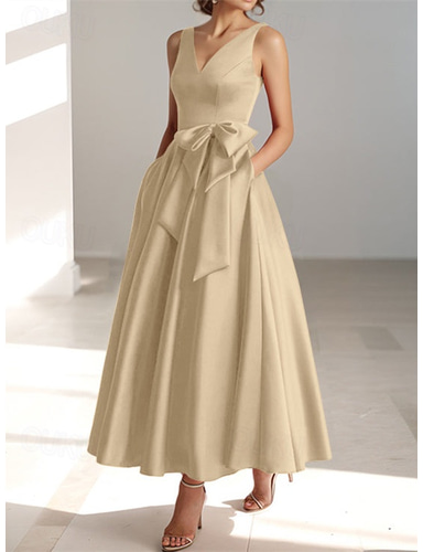 A-linje Telång Cocktailklänningar Festklänningar Elegant Kort och lång Ärmlös V-hals Bröllopsgäst Kentucky Derby Ficka Satäng med Rosett(er)