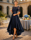 A-linje Asymmetrisk Telång Festklänning Cocktail klänning Bröllopsgästklänning Klänning till brudens mor Kortärmad Rundhals Elegant Kort och lång Bröllopsgäst Bröllopsfest Satäng Spets med Rosett(er