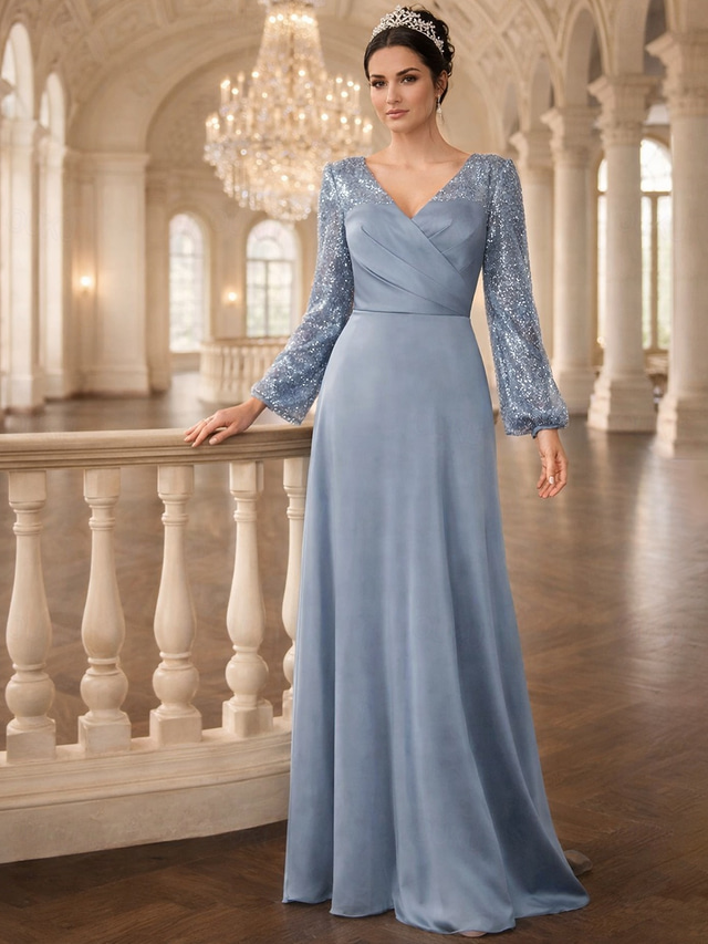 Tillfälle:Bröllopsgäst,Formell,Stil:minimalist,Elegant,Enkel,Ledigt,Silhuett:A-linje,Fåll / släp:Golvlång,Halslinje:V-hals,Material:Paljetter,Satäng,Ryggdetaljer:Dragkedja,Ärmlängd:Långärmad,Utsmyckning:Plisserat,Helfodrad:Ja,Tips:Färgerna kan variera något beroende på olika bildskärmsinställningar,Endast professionell kemtvätt,Klänningstyp:Formell klädsel,Bröllopsgästklänning,Aftonklänning,
