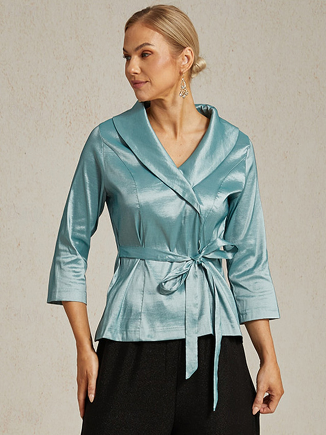 Dam Blus Kvällstoppar knyt fram Elegant Metallisk Stylish 3/4 ärm V-hals Vanliga toppar Kvällsfest Bröllopsgäst Semiformell Dammig blå Vår, Höst, Vinter, Sommar