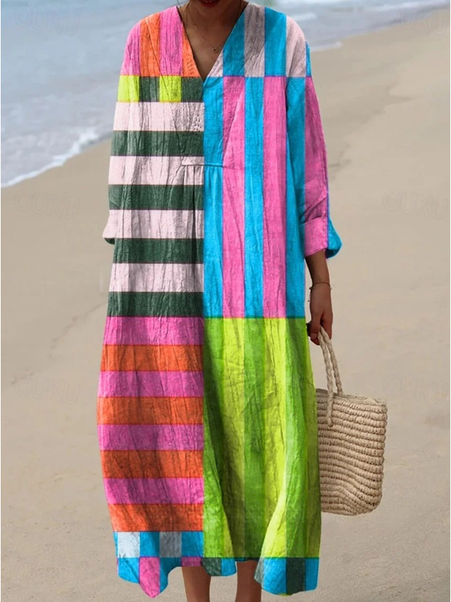 Klänningstyp:Solklänning,Skiftklänning,Material:Polyester,Kön:Dam,Design:Mönster,Lappverk,Tillfälle:Strand,Utekväll,Stil:Semester,Ledigt,Utskrifttyp:Tryck,Passform:Lös passning,Klänningslängd:Maxiklänning,Halslinje:V-hals,Ärmlängd:Långärmad,Tjocklek:Medium,Elasticitet:Oelastisk,Ta hand om mig:Maskintvätt,Mönster:Grafisk,Abstrakt,Geometrisk,Rand,Årstid:Sommar,Vår,