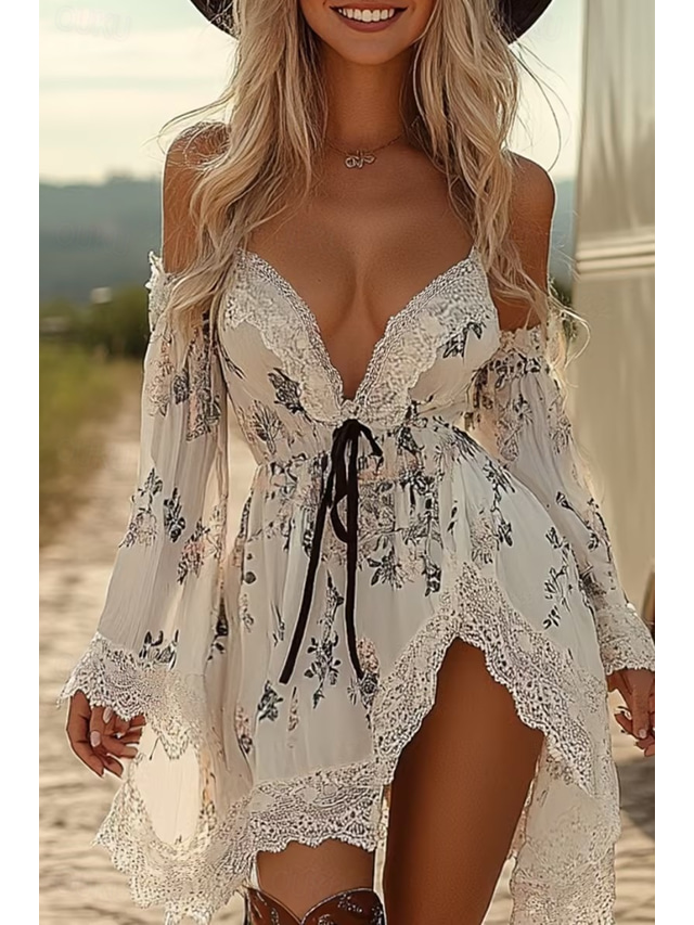 Dam Mini klänning Boho-klänning Västerländsk klänning Mode Dagligen Semester Utekväll Normal Blomma Långärmad V-hals Vit Sommar