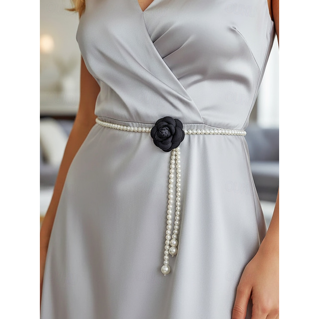 Damhalsband med kameliafärgad pärlkedja i svartvitt, eleganta smycken för bröllop, kvällsfest, kontorspendling och formella tillfällen.