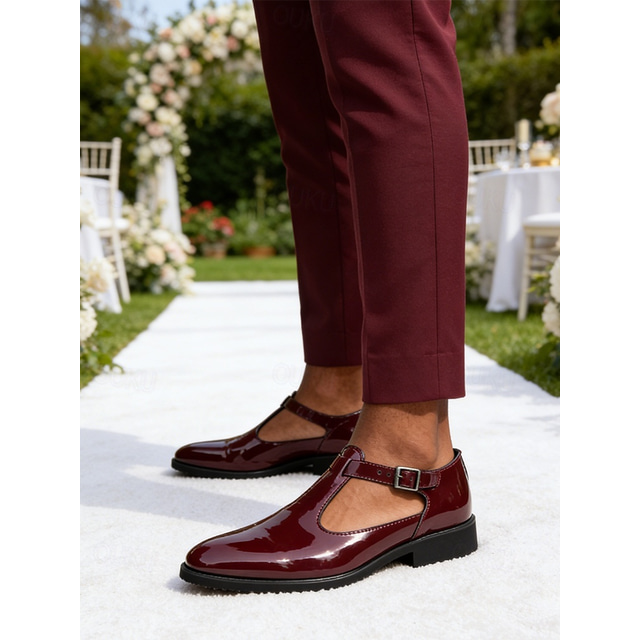Herrskor i vinröda lack med remmar i konstläder och munkremmar, glansiga formella bröllopsloafers för brudgum, bröllopsgäster, mottagningsfester, banketter, ceremonier och eleganta kvällskläder.