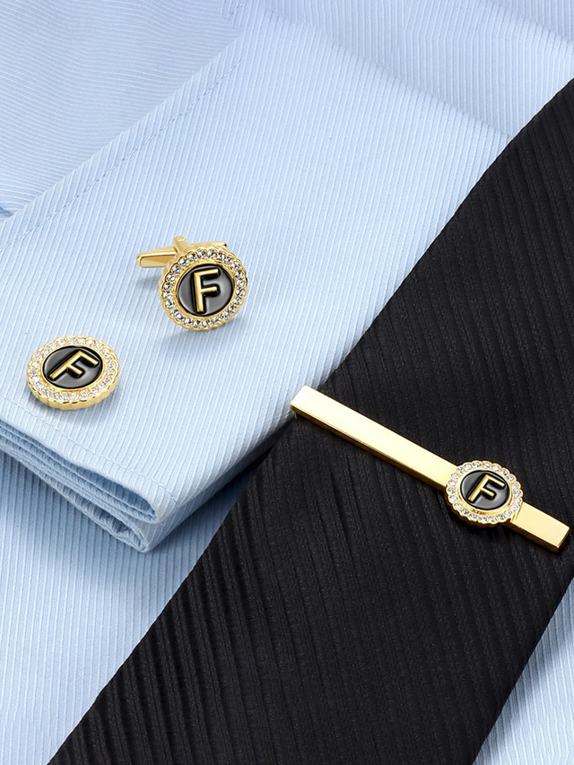 Slipsklämma, manschettknappar och kavajnål i herrlegering – elegant svart och gulddesign med kristalldetaljer, personligt med 26 initialer, perfekt present för formella evenemang och affärskläder