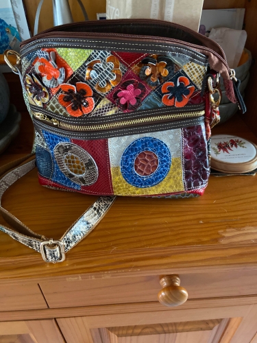 Love this pretty coloured bag. dimensions as stated in ad. get two looks with the different design to back of bag. stitching to leather looks good, colours are bright without being childish. hardware appears fine. Small but can take essential = phone,wallet,makeup etc,. Handy original shoulder bag. Only remark would be to put in lighter coloured lining to make it easier to find items inside. Love this pretty coloured bag. dimensions as stated in ad. get two looks with the different design to back of bag. stitching to leather looks good, colours are bright without being childish. hardware appears fine. Small but can take essential = phone,wallet,makeup etc,. Handy original shoulder bag. Only remark would be to put in lighter coloured lining to make it easier to find items inside.