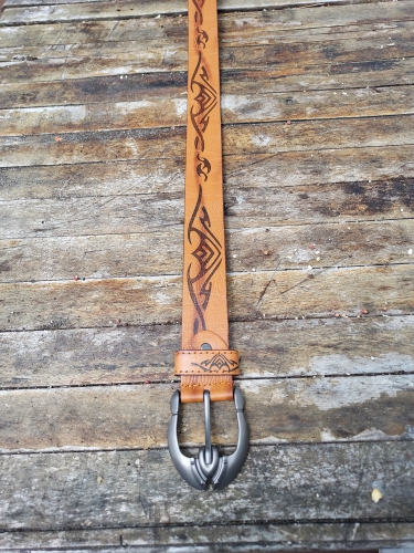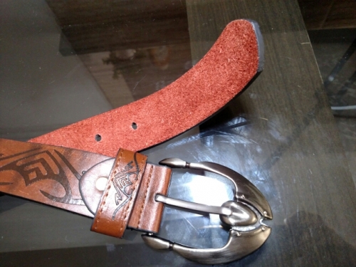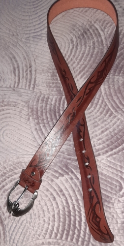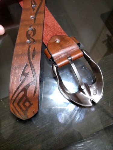 I got the belt today. The Tribal designs on it look good I will probably get another for me. The only thing was it took a long time to arrive.