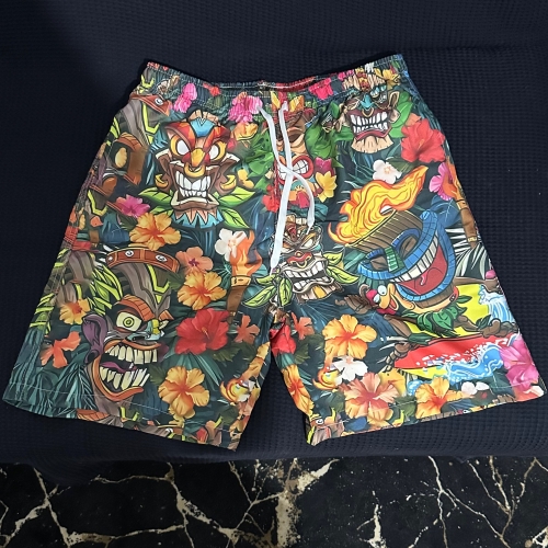 Decent pair of polyester swim shorts with a cool Tiki print as pictured. It even has a liner! Glad I ordered one size larger than my actual size, otherwise it would have been too small. Decent pair of polyester swim shorts with a cool Tiki print as pictured. It even has a liner! Glad I ordered one size larger than my actual size, otherwise it would have been too small.