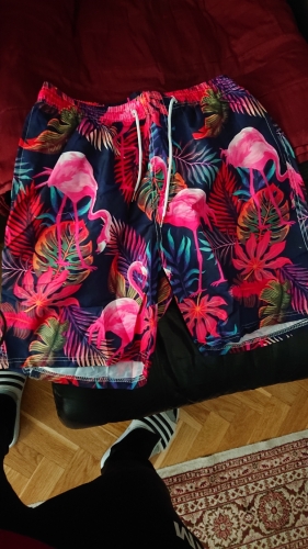 Print colors are vibrant, but some darker areas appear more like "glossy" and mixture of dark black and deep green, almost like oil. Overall still serves the purpose of a prank outfit that I will complement with another flamingo-themed shirt bought previously. Print colors are vibrant, but some darker areas appear more like "glossy" and mixture of dark black and deep green, almost like oil. Overall still serves the purpose of a prank outfit that I will complement with another flamingo-themed shirt bought previously.