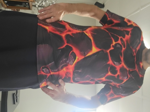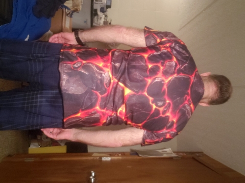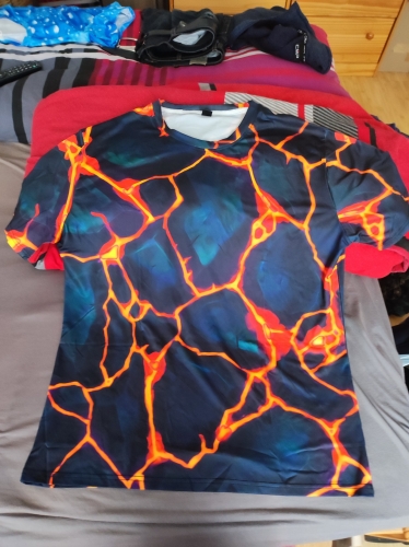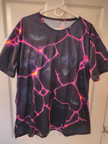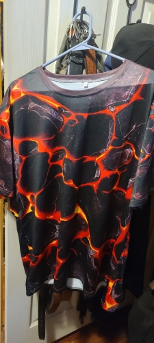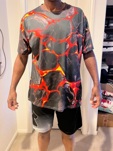 The print print style for this shirt Is Very Cool. Reminds me of the Character on the Fantastic 4 who was the Rock.