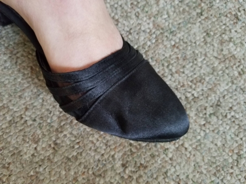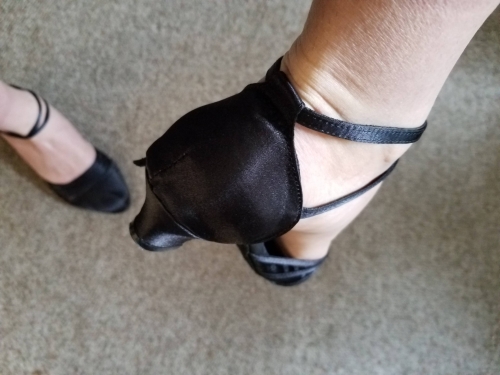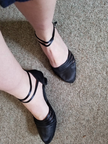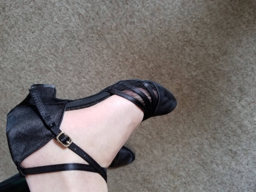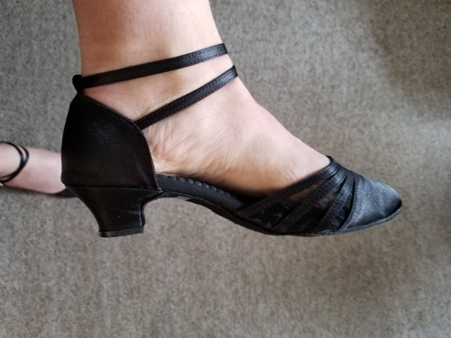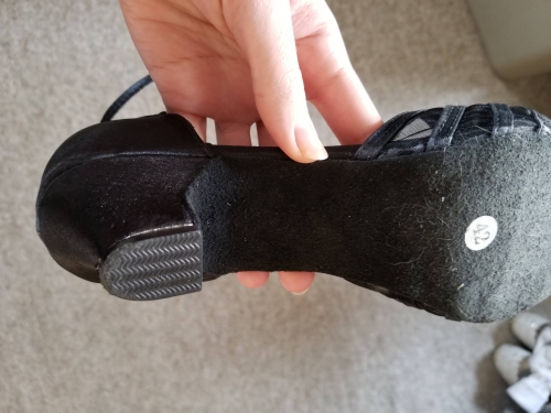 I just got these shoes yesterday before class and danced more than 2 hours in them with no problems! I usually wear a 10.5 or 11 street shoe, but ordered a 9.5-10 and they fit well. As shown in the advertisement, the black style is not sparkly. I chose the thick, 1 1/2 inch heel. The heel does not have leather on it like the rest of the sole. The fabric cleaned up very nicely after being stepped on a few times during the evening. I like the buckle system, which is one of the reasons I bought these, as my last pair had double snap straps and they come unsnapped when you pass your feet close in waltz, so Im really looking forward to these! I just got these shoes yesterday before class and danced more than 2 hours in them with no problems! I usually wear a 10.5 or 11 street shoe, but ordered a 9.5-10 and they fit well. As shown in the advertisement, the black style is not sparkly. I chose the thick, 1 1/2 inch heel. The heel does not have leather on it like the rest of the sole. The fabric cleaned up very nicely after being stepped on a few times during the evening. I like the buckle system, which is one of the reasons I bought these, as my last pair had double snap straps and they come unsnapped when you pass your feet close in waltz, so Im really looking forward to these!
